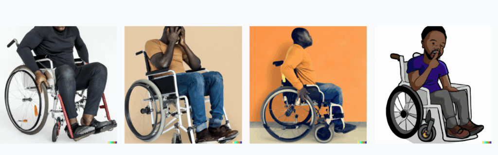 - Lorsque j’utilise le script (message qui permet de lancer la génération d’une image, par exemple), “Personne en situation de handicap”, le rendu est en majorité une représentation d’une personne avec un fauteuil roulant.