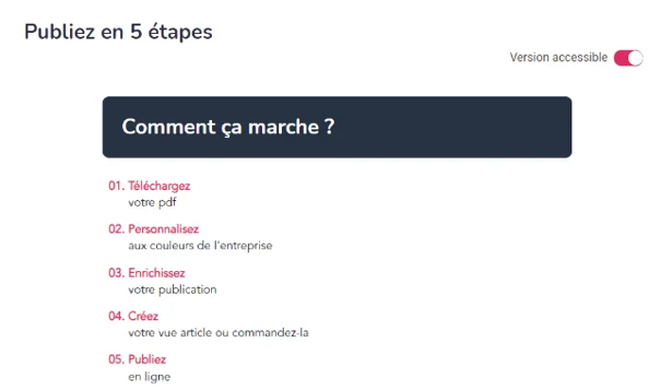 Grâce à PubliSpeakTM, transformez vos PDF en sites web interactifs, responsives et e-accessibles. Profitez d’une plateforme SaaS qui vous fait gagner en productivité.